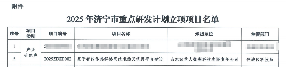 近日,济宁市科技局公示2025年济宁市重点研发计划(含软科学项目)拟立项名单,政金大数据集团权属企业山东政信大数据科技有限责任公司的基于智能体集群协同技术的天机网平台建设项目入选。